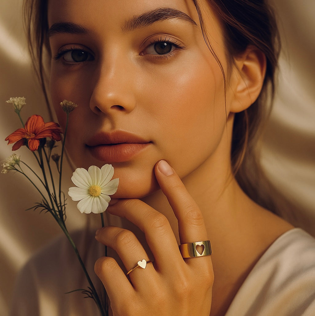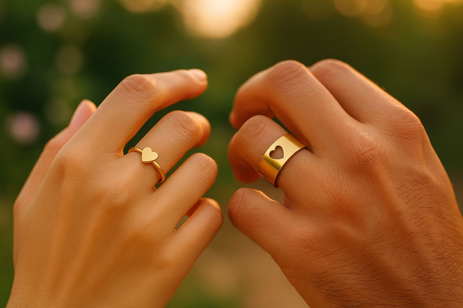 • Diseño simbólico: dos anillos complementarios — uno con un corazón hueco y el otro con un corazón lleno, que representan la armonía y el vínculo entre dos almas.